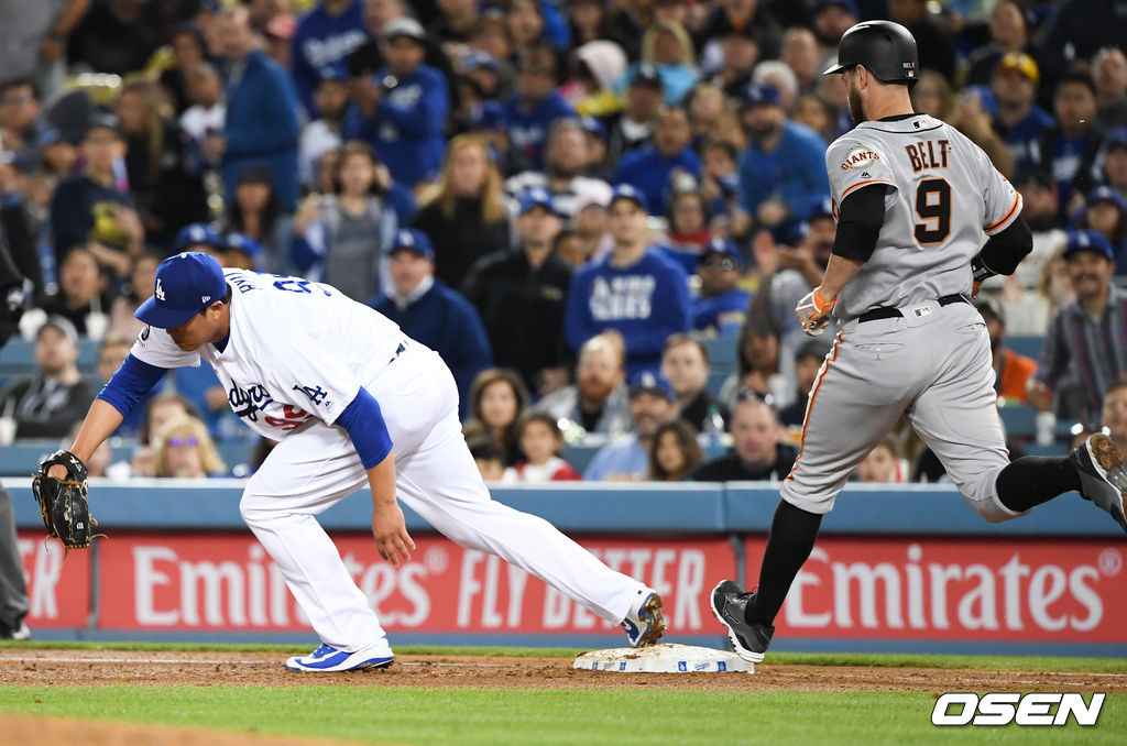 류현진은 4회초 선두타자를 삼진으로 돌려세운 후 브랜든 벨트를 상대했다. 2구째를 받아친 벨트의 타구는 우전안타가 되는 듯 했지만 수비 쉬프트로 깊숙히 자리 잡고 있던 키케가 멋진 다이빙 캐치를 선보였다.