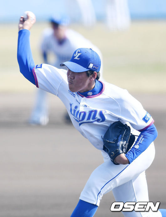 장지훈은 3일 오후 경산 볼파크에서 열린 경찰 야구단과의 교류전에 선발 등판, 1.2이닝 2피안타 1볼넷 2탈삼진 3실점(1자책)을 기록했다. 총투구수 32개 가운데 스트라이크는 18개.