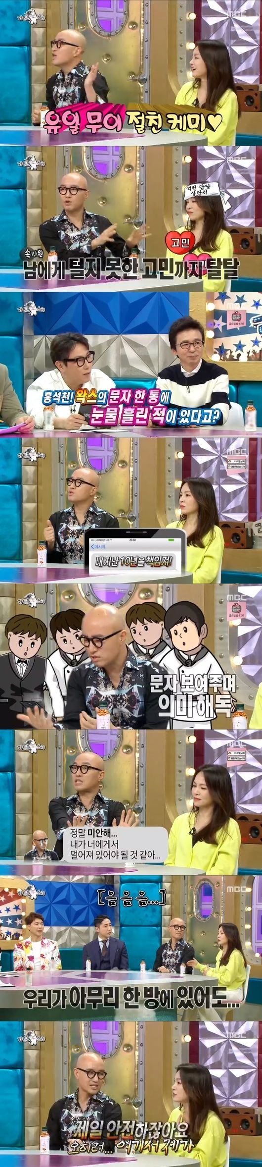 "왁스의 문자 한 통에 눈물을 흘린 적이 있냐?"는 질문에 홍석천은 "왁스한테 문자가 왔는데, '내 지난 10년을 책임져'라고 왔더라. 너무 놀라서 '정말 미안해. 내가 너한테 멀어져 있어야 될 것 같다'고 답장을 보냈다. 나중에 '뭐래' 이렇게 왔다"고 말했다. 이에 왁스는 "진심이 아니라 그냥 투정으로 보냈다"며 웃었다.