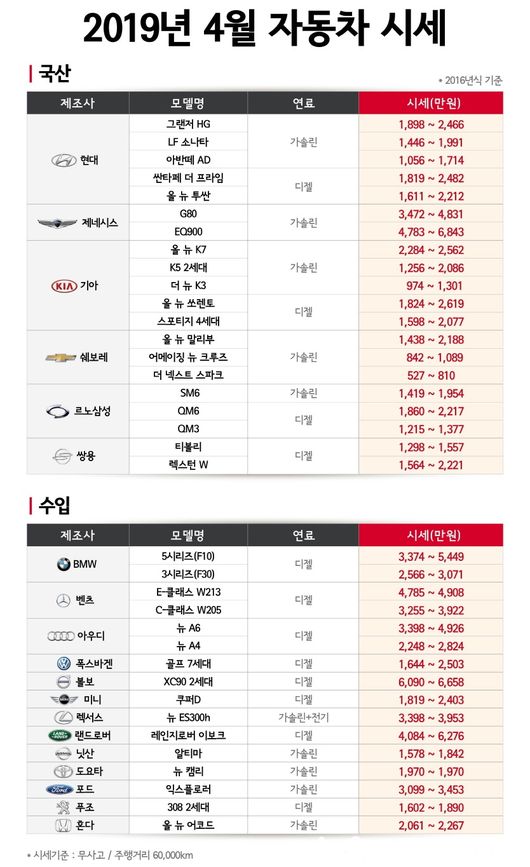 SK엔카닷컴이 발표한 4월 시세는 현대자동차, 기아자동차, 쌍용자동차 등 국내 완성차 브랜드와 BMW, 벤츠, 렉서스 등 수입 브랜드의 2016년식 인기 차종을 집계한 결과물이다.