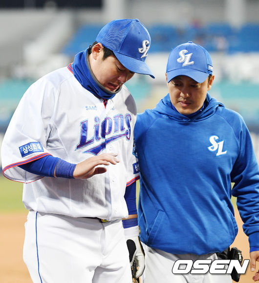 이원석(삼성)이 4일 대구 KIA전서 오른손 검지 통증로 교체됐다.