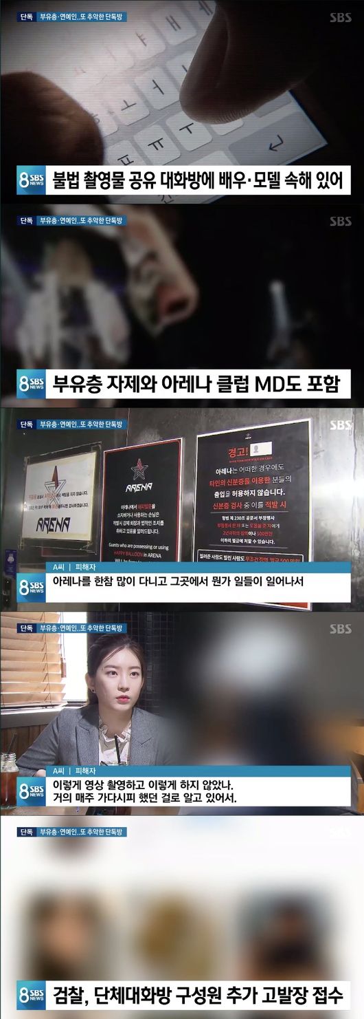 SBS '8뉴스'에서 현직 배우와 모델이 속한 불법 동영상 촬영 및 유포 단체 대화방을 포착했다. 영화배우 신씨와 한씨, 모델 정씨 등이 연루 의혹에 휩싸였다.