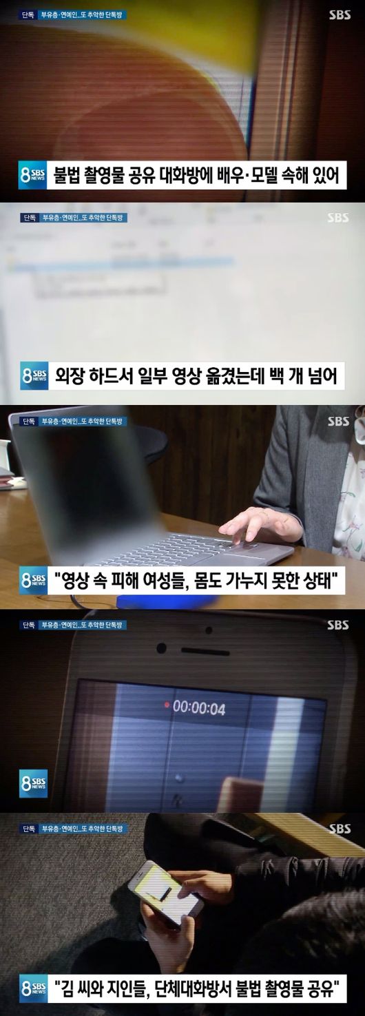 지난 4일 방송된 SBS '8뉴스'에서는 영화배우 신 씨와 한 씨, 모델 정 씨, 대기업 아들, 클럽 아레나 직원 등이 포함된 단체 대화방이 발견된 사실을 보도했다. 해당 단체 대화방에서 수십 명의 불법 촬영 피해자가 발생했다고 전해졌다.