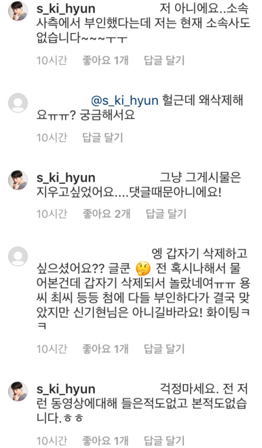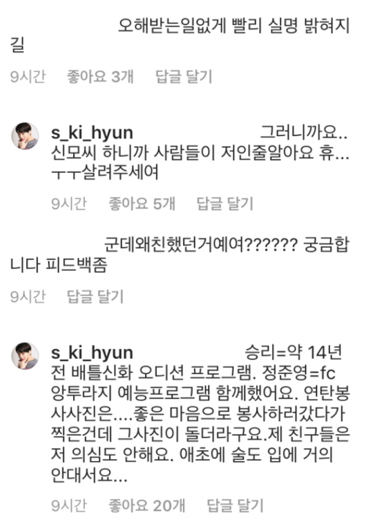 또 신기현은 "오해받는 일 없게 빨리 실명 밝혀지길"이라는 댓글에 "신 모 씨 하니까 사람들이 다 저인 줄 안다. 휴. 살려달라"고 답했다.