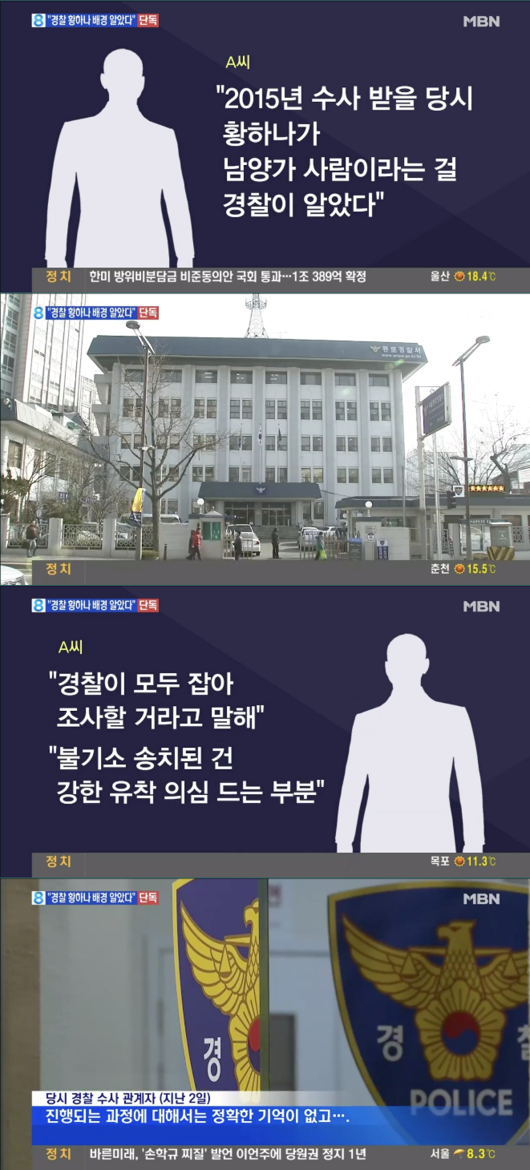 5일 MBN은 황하나가 2015년 마약수사 당시 경찰과 유착한 의혹을 보도 했다. MBN은 2015년 황하나와 함께 수사를 받은 피의자 중 한명의 진술을 보도했다. 보도에 따르면 A씨는 “2015년 수사 당시 경찰이 황하나가 남양가 사람이라는 것을 알고 있었다”며 “황하나가 2011년 대마초 흡연 혐의로 기소유예 받은 사실도 알았다. 경찰이 모두를 수사하겠다고 했는데, 1년 7개월이 지나 불구속 기소 된 것을 보면 경찰 유착 의혹이 있다”고 밝혔다.