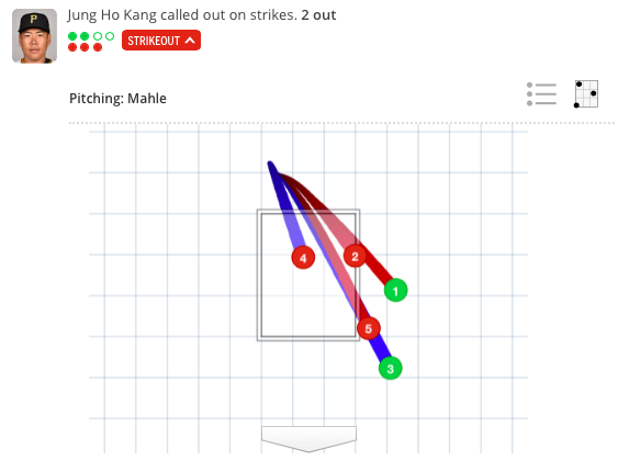 MLB.com 게임 데이를 보면 말리의 5구째 공은 스트라이크존을 벗어났다. 바깥쪽 낮게 공 1개가 빠졌다. 하지만 구심을 맡은 브라이언 오노라 심판의 손이 올라갔고, 강정호는 고개를 갸웃하며 타석에서 물러났다.