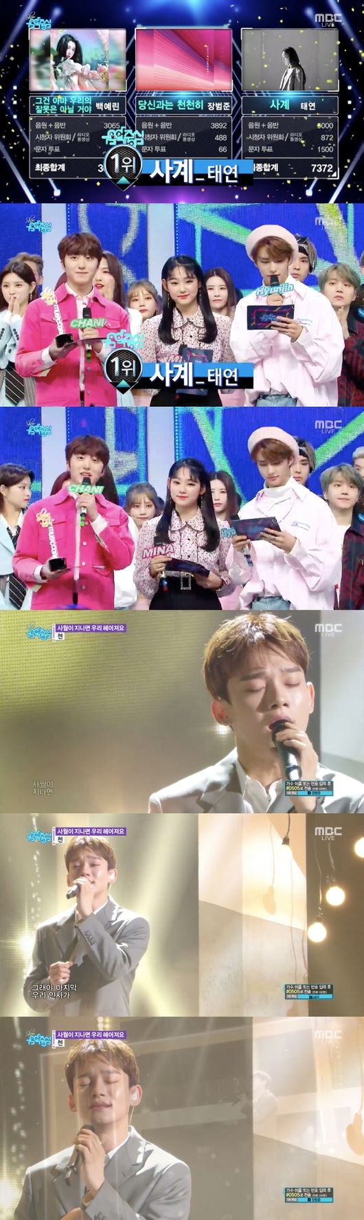 6일 방송된 MBC '쇼! 음악중심'(이하 '음악중심')에서는 백예린, 장범준, 태연이 1위 후보로 오른 가운데, 태연이 '사계'로 트로피를 거머쥐었다.