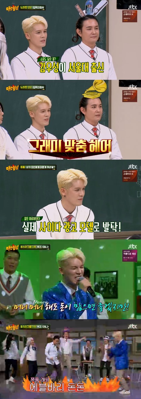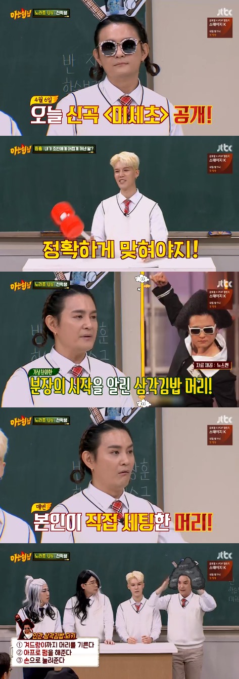 지난 6일 방송된 JTBC 예능 '아는형님'에서는 UV(유세윤, 뮤지)와 노라조(조빈, 원흠)가 전학생으로 출연하는 모습이 전파를 탔다.