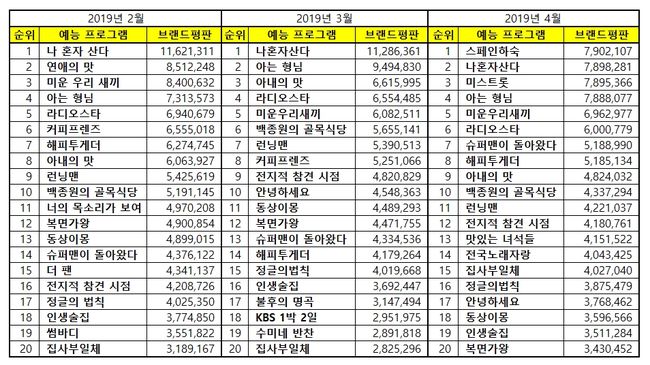 2019년 4월 예능 프로그램 브랜드평판 20위 순위는 스페인하숙, 나혼자산다, 미스트롯, 아는 형님, 미운우리새끼, 라디오스타, 슈퍼맨이 돌아왔다, 해피투게더, 아내의 맛, 백종원의 골목식당, 런닝맨, 전지적 참견 시점, 맛있는 녀석들, 전국노래자랑, 집사부일체, 정글의법칙, 안녕하세요, 동상이몽, 인생술집, 복면가왕 으로 분석되었다.