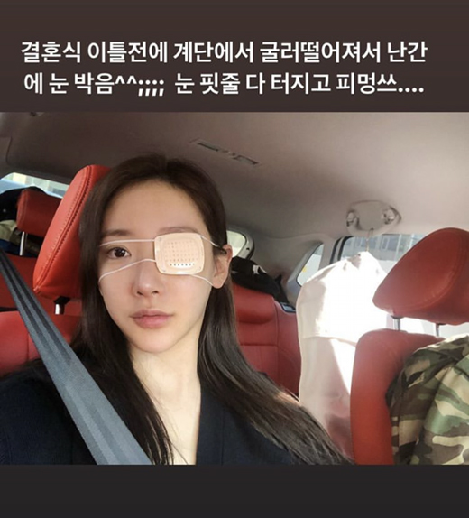 사실 결혼식 당일까지도 이들 커플은 시트콤 같은 에피소드를 만들었다. 송다예는 5일 "결혼식 이틀 전에 계단에서 굴러떨어져서 난간에 눈 박음. 눈 핏줄 다 터지고 피멍쓰"라는 글과 함께 한쪽 눈에 안대를 한 모습을 공개했다. 안대 낀 신부로 거듭난 그는 눈에 시퍼렇게 멍든 사진까지 공개하며 팬들의 걱정을 샀다.