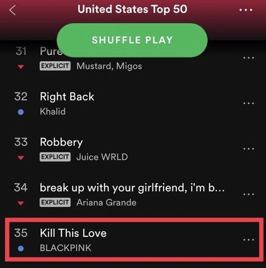 블랙핑크 새 EP앨범 타이틀 곡 ‘킬 디스 러브(KILL THIS LOVE)’는 7일 현재 스포티파이(Spotify) 글로벌 톱50 차트에서 4위를 기록하며 기세를 뽐내고 있다. 또 미국 톱50 차트에는 35위를 기록, 미국 내 인기 예열을 시작했다.