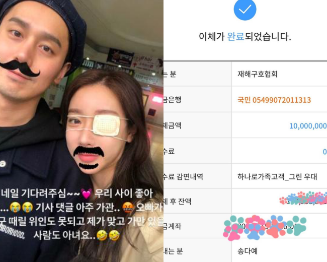 물론 이에 앞서 송다예는 “화재로 인해 피해를 입으신 분들께 조금이나마 도움이 되고자 신랑과 상의 후에 기부에 참여하게 됐습니다. 크지 않은 금액이지만 큰 힘이 되길 간절히 바랍니다”라며 천만 원을 강원 산불피해 성금으로 기부, 선행에 동참했다.