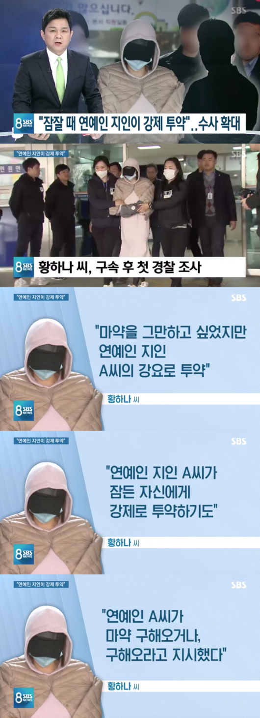 7일 방송된 SBS ‘8뉴스’에 따르면 황하나는 이날 구속 후 첫 경찰 조사를 받았다. 황하나는 경찰에 마약 투약 혐의는 시인했지만 연예인 A씨의 권유로 다시 마약에 손을 대게 됐다고 억울해했다.