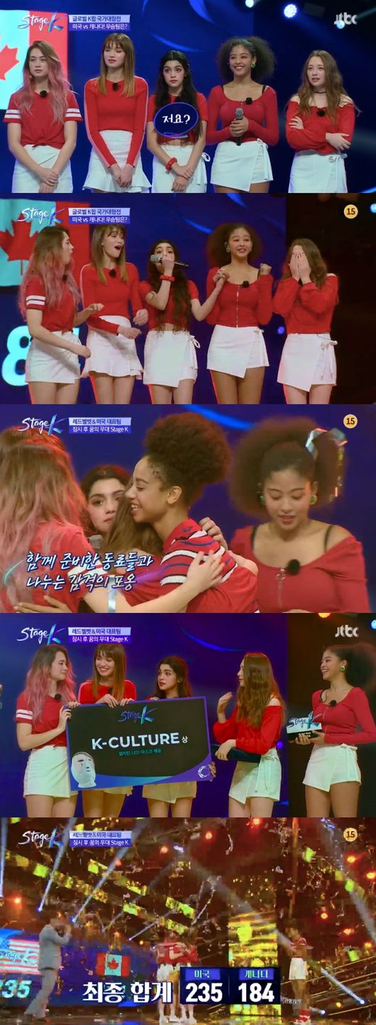 7일 오후 방송된 JTBC 예능 ‘스테이지K’에서 미국 대표, 캐나다 대표, 일본 대표, 독일 대표팀이 레드벨벳의 노래로 무대를 꾸미는 국가별 대결이 이뤄진 가운데, 미국과 캐나다팀이 결승에 올라 최종전을 펼쳤다. 5인으로 구성된 미국 대표팀이 우승하면서 레드벨벳과 '빨간 맛' 무대를 만들었다.
