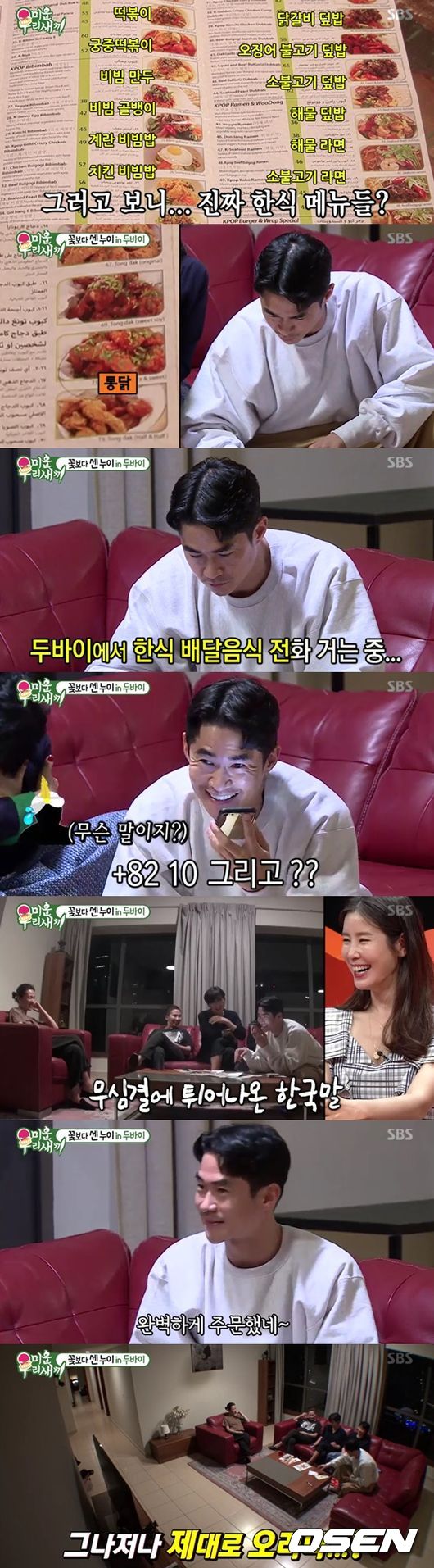 이때 누나들이 "배고 고프다"면서 배정남을 불렀다. 배정남은 "두바이가 배달이 잘 된다더라"면서 배달 전단지를 꺼냈다. 한식까지 있어 모두를 놀라게 했다. 두바이에서 한식 배달이 되는 상황에 배정남은 "한국에서 배달오는 거 아니냐"며 놀라워할 정도였다. 전세계로 뻗어가는 한식의 인기를 실감하게 했다. 배정남이 대표로 배달을 주문, 주문하기 위해 국가번호를 눌러 시도, 한국말 메뉴를 알아듣는 모습이 웃음을 안겼다.