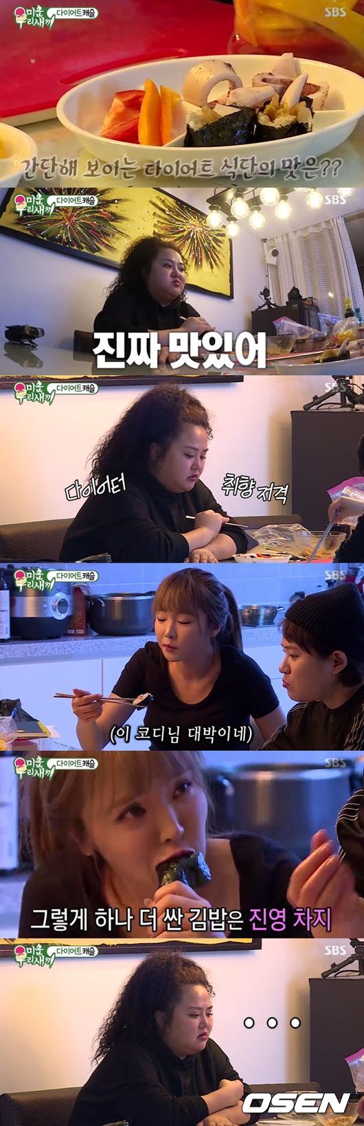홍진영과 언니 홍선영이 다이어트 코디로 나선 김신영이 그려졌다. 한 바탕 웃은 후 다시 다이어트 요리를 시작, 씻은 묵은지에 들기름을 부어 다시 요리를 이어갔다. 바로 오징어와 들기름 양념을 넣은 묵은지를 넣어 현미김밥을 만들었다. 정량 배식을 위해 식판에 정갈하게 음식들을 담았다. 이어 이를 맛 본후 홍자매는 "너무 맛있다"며 감탄했다. 다이어트에 취향저격이라고. 6년 노하우가 만들어낸 오징어 현미 김밥이었다.