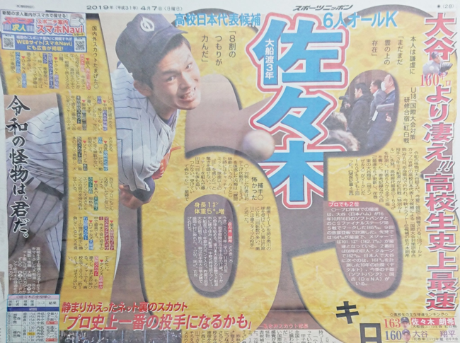 [사진] 사사키의 163km 구속 기록을 보도한 '스포츠닛폰'의 보도.