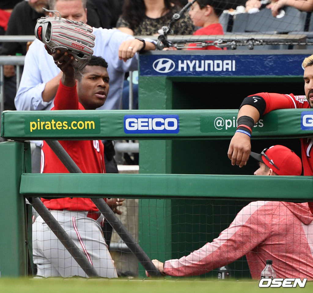 푸이그는 팀 동료 조이 보토, 피츠버그 멜키 카브레라와 웃으며 대화를 나누며 진정하는 듯 했으나.
