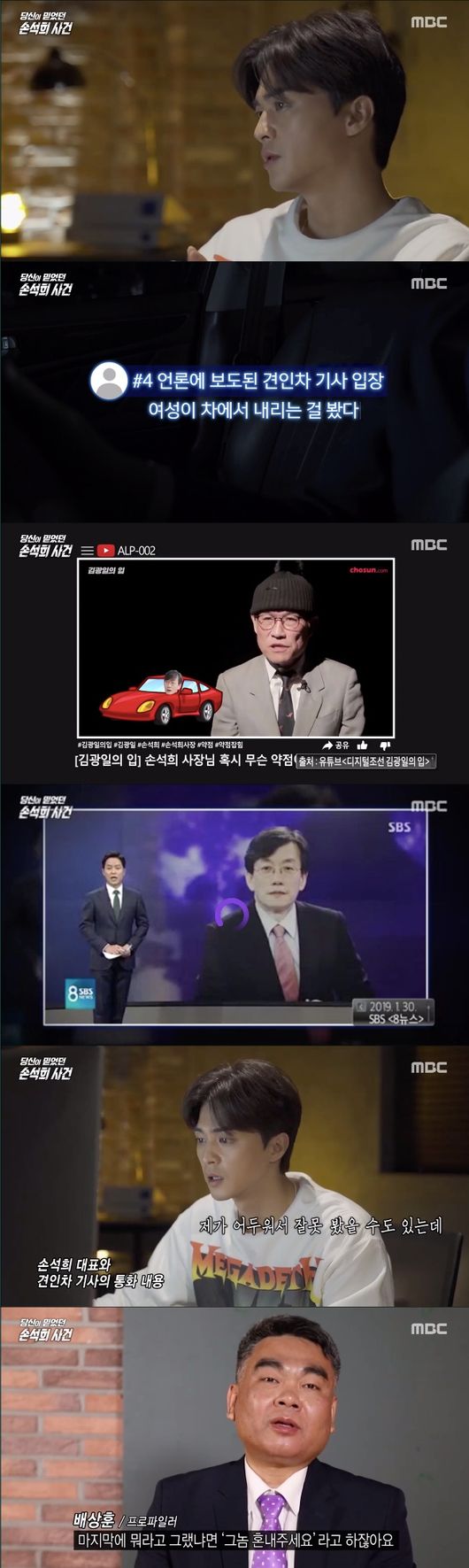 '페이크'의 진행자 '서처K' 김지훈은 올해 초 세간을 떠들썩하게 만든 손석희 대표의 관련 의혹들에 대해 관련 뉴스를 살피며 팩트를 추적했다. 보도들은 손석희 대표가 과천 모처에서 견인차와 접촉 사고를 낸 점, 사고 당시 차량에 젊은 여성이 동승자로 타고 있었다고 주장했다. 또한 사고 당시 손석희 대표가 경찰로부터 음주 측정을 받았으며, 뺑소니 의혹까지 받았다고 주장했다.