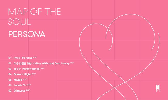 공개된 새 앨범의 트랙리스트에는 리더 RM의 솔로곡이자 컴백 트레일러 영상을 통해 먼저 소개된 ‘Intro : Persona’를 시작으로 타이틀 곡 ‘작은 것들을 위한 시 (Boy With Luv) feat. Halsey’, ‘소우주 (Mikrokosmos)’, ‘Make It Right’, ‘HOME’, ‘Jamais Vu’, ‘Dionysus’까지 총 7개의 트랙이 담겼다.
