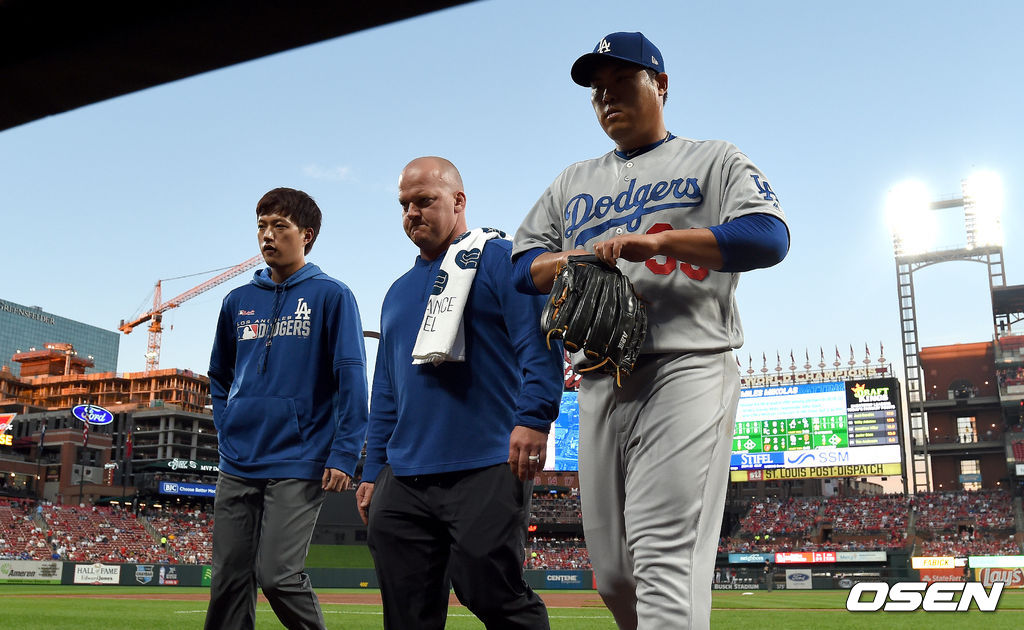 류현진은 9일(이하 한국시간) 미국 미주리주 세인트루이스 부시스타디움에서 펼쳐진 세인트루이스 카디널스와의 원정경기에서 1⅔이닝 2피안타(1피홈런) 2실점 이후 사타구니에 통증을 느끼고 일찍 마운드를 내려왔다.