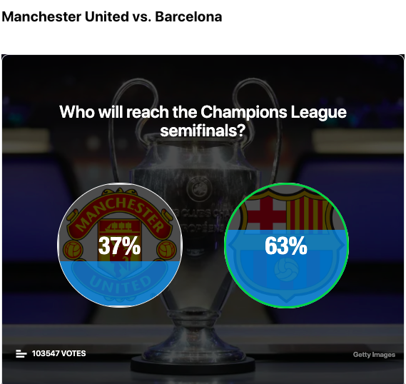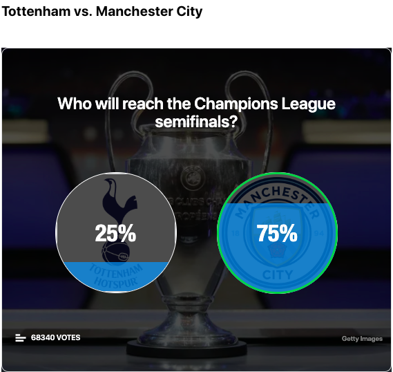 토트넘-맨시티 경기 승자로 6만800여명 중 토트넘 승리를 25%, 맨시티 승리를 75%가 지지했다. 리버풀-포르투 경기는 설문에 응한 6만여명 중 무려 91%가 리버풀 승리를 점쳤다.