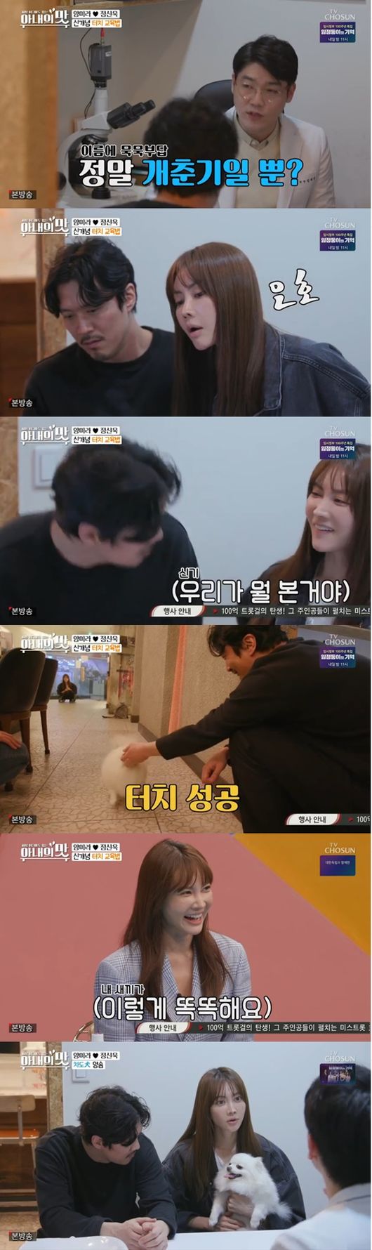 양미라와 정신욱 부부가 그려졌다. 애완견 건강검진을 위해 병원을 찾았다. 이어 부르면 오지않는다며 고민을 토로했다. 수의사는 지금 필요한 것은 터치교육이라고 했다. 포인트는 손에있는 간식이라고 했다. 익숙해지면 자동으로 터치할 것이라며 실전 교육을 전했다. 이어 애완견을 위한 독립집이 필요하다고 조언했다.