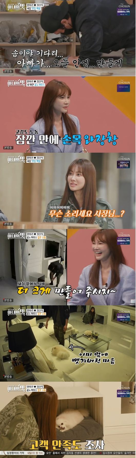 남편 신욱은 프로향기 물씬 풍기는 모습으로 무언가 준비했다. 한창 샌딩작업을 마친 후, 하루만에 애완견의 단독 하우스를 완성했다. 양미라는 남편이 만들어온 집을 예쁘게 꾸미며 애완견 수영운동까지 살뜰하게 챙겼다.