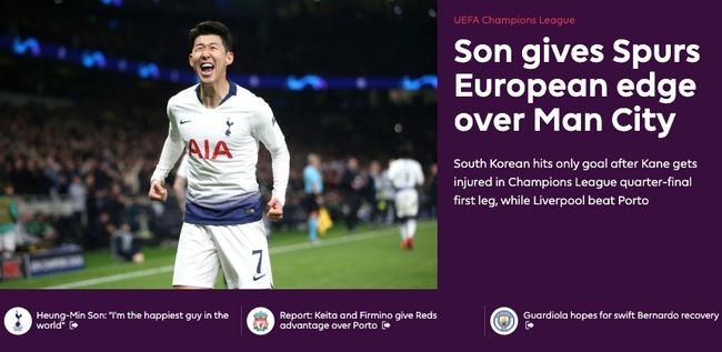 토트넘은 10일(이하 한국시간) 새벽 영국 런던 토트넘 핫스퍼 스타디움서 열린 맨체스터 시티와 2018-2019시즌 유럽축구연맹(UEFA) 챔피언스리그(UCL) 8강 1차전서 후반 33분 손흥민의 결승골에 힘입어 1-0으로 승리했다.