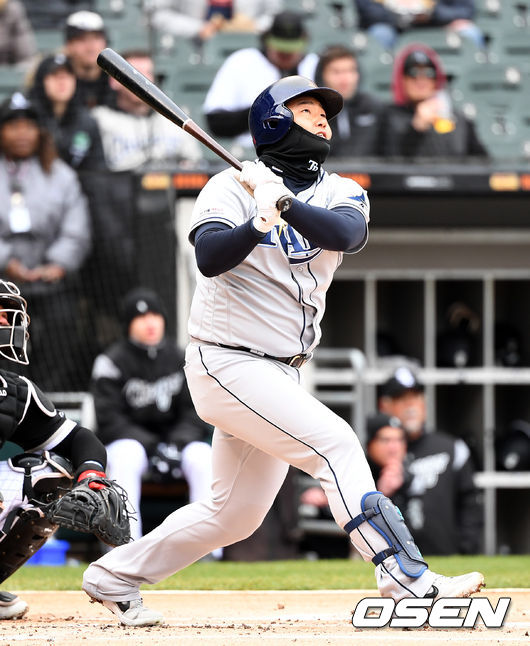 1회초 토미 팸의 투런 홈런이 터진 뒤 타석에 들어선 최지만. 화이트삭스 우완 선발 레이날도 로페스를 만나 초구 바깥쪽 볼을 골라낸 뒤 2구째 75.8마일 커브를 받아쳤으나 우익수 뜬공으로 잡혔다.