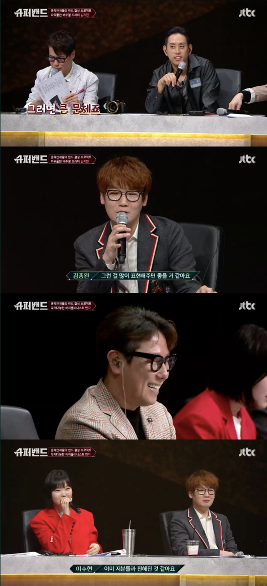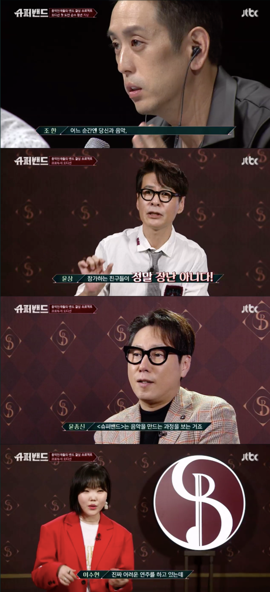 지난 12일 오후 처음 방송된 JTBC ‘슈퍼밴드’에서는 윤종신, 윤상, 조한, 김종완, 이수현이 1조와 2조 참가자들을 평가했다.