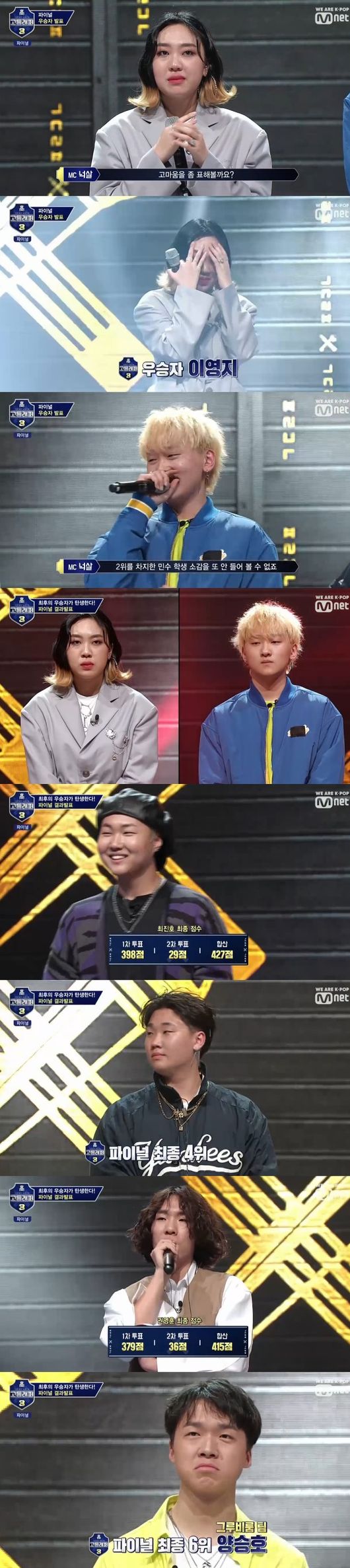 지난 12일 방송된 Mnet 예능 '고등래퍼3' 최종회에서는 파이널 무대를 꾸미는 권영훈, 최진호, 양승호, 이영지, 강민수, 이진우의 모습이 전파를 탔다.