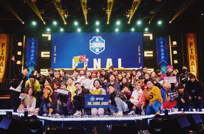 사진 속' 고등래퍼3' 전 출연진과 스태프들은 '고등래퍼3' 무대에서 기념 사진을 남기고 있다. 특히 이영지는 장학금 천 만원과 축하 꽃다발을 들고 환하게 웃는 중이다.