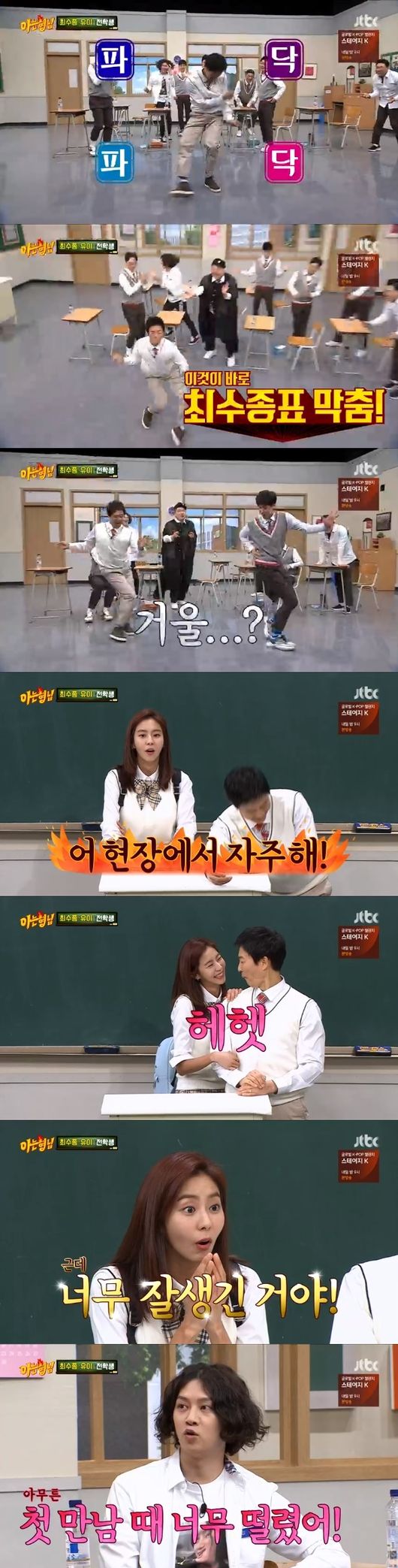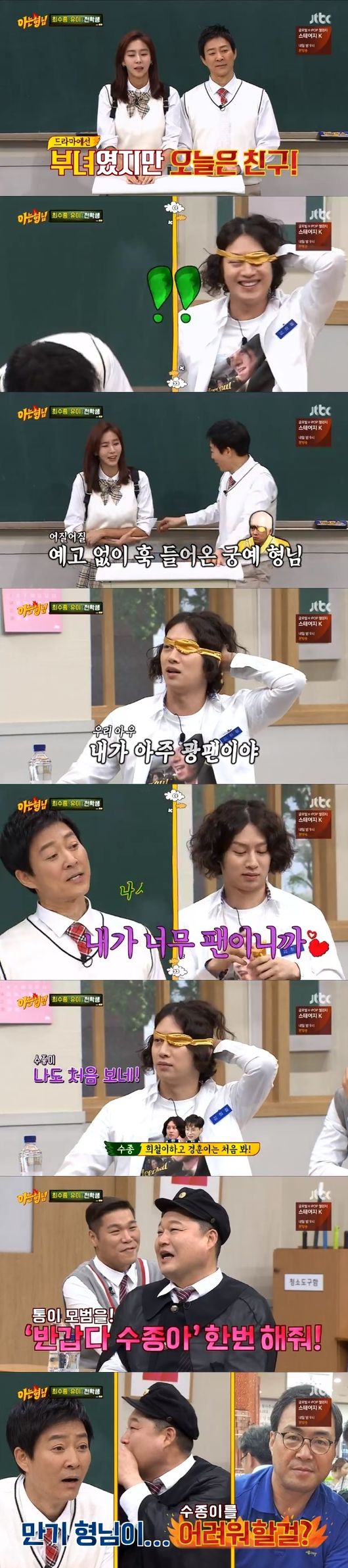 강호동은 유이의 '스타킹' 시절을 언급했고, 유이는 "내가 그때 비욘세보다 '싱글레이디'를 많이 춘 것 같다. 길거리에 지나가고 있을 때도 그 춤을 시켰다. 내가 호동이를 좋아하지만, 같이 예능을 하면 잘해야 된다는 부담감이 있다. 수종이가 예능을 나간다고 해서 무조건 같이 한다고 했는데 '아는형님'이라고 해서 조금 고민했다"고 털어놔 웃음을 자아냈다.