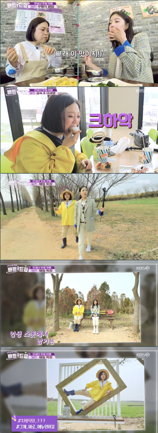 뿐만 아니라 이날 김숙, 이세영은 휴게소 먹거리로 뷔페 타임을 갖는가 하면 당진의 향토음식인 우렁 쌈밥을 초토화시켰다. 그야말로 두사람은 여자들끼리 즐기는 우정 여행의 진수를 보여줘 눈길을 끌었다./misskim321@osen.co.kr