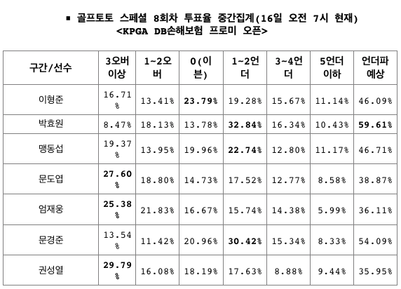 국내 골프팬들은 ‘KPGA DB손해보험 프로미 오픈’ 1라운드에서 박효원의 언더파 가능성을 가장 높게 내다봤다.