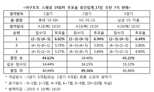 KBO 3경기 대상 야구토토 스페셜 19회차 투표율 중간집계