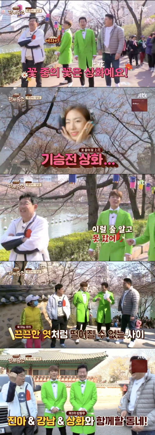 이날 태진아는 강남과 공개 열애 중인 이상화 선수에 대해서도 언급헤 눈길을 끌었다. 강호동은 만개한 봄꽃을 보면서 강남의 연인인 이상화 선수에 대해 언급했다. 그러자 강남은 “이럴 줄 알고 못 잤다”라며 민망해했다.
