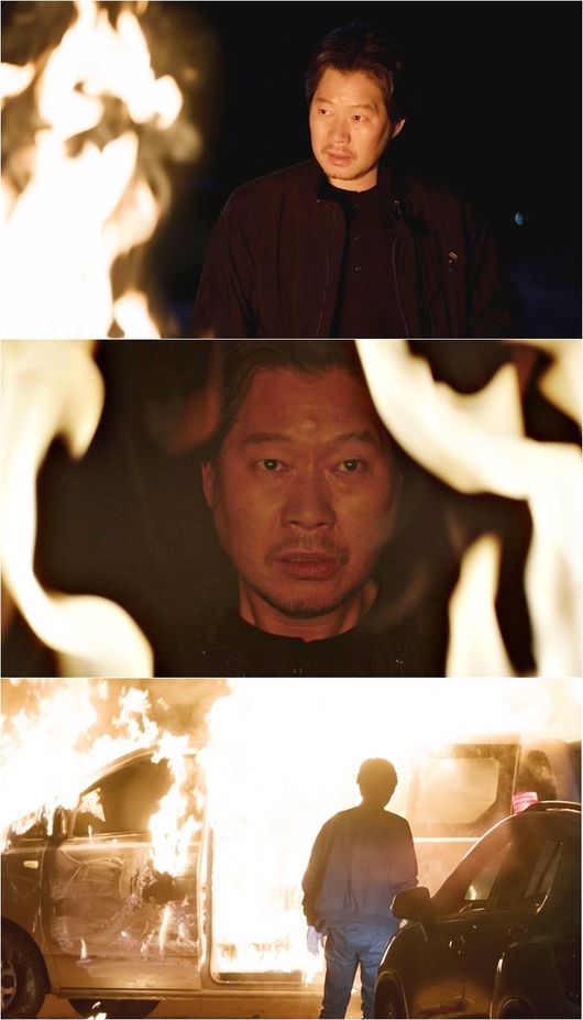 ‘자백’ 유재명이 거대한 화염 앞에 섰다.