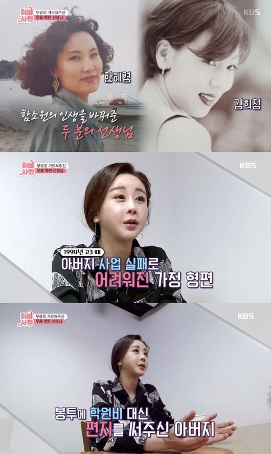 지난 19일 방송된 KBS1 ‘TV는 사랑을 싣고’에서 함소원이 무용입시학원 한혜경 원장, 전공 담임 김희정 선생님을 찾은 모습이 담겼다.