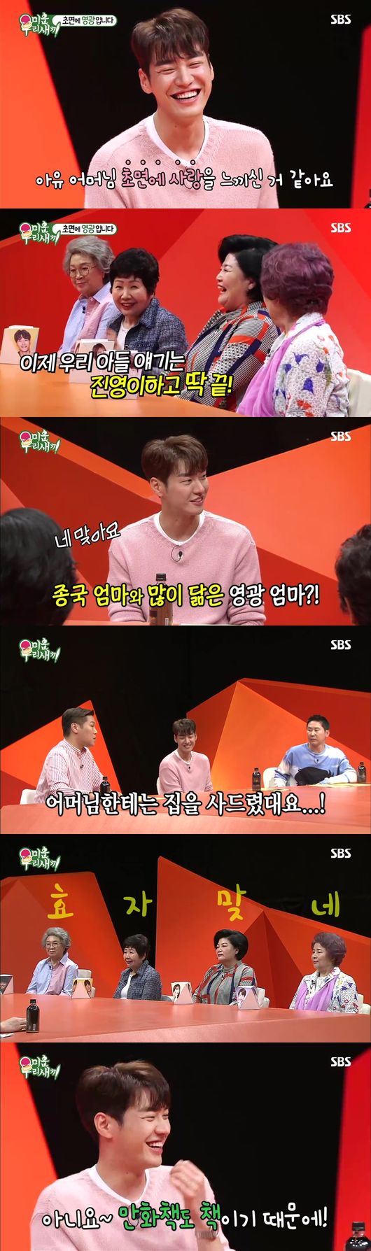 이날 방송에는 5월에 시작하는 새 월화드라마 ‘초면에 사랑합니다’의 남주인공 김영광이 스페셜 MC로 출연해 어머니들의 사랑을 한몸에 받았다. 특히, 홍진영 어머니가 진영이 보다 두 살 연하인 김영광에게 특별한 관심을 보이자 김종국 어머니는 “이제 우리 아들 이야기는 진영이하고 딱 끝”이라며 귀여운 질투를 해 웃음을 안겼다. 이에 김영광은 김종국 어머니의 헤어스타일부터 미소까지 자신의 어머니와 꼭 닮았다고 전해 마음을 풀어드렸다.