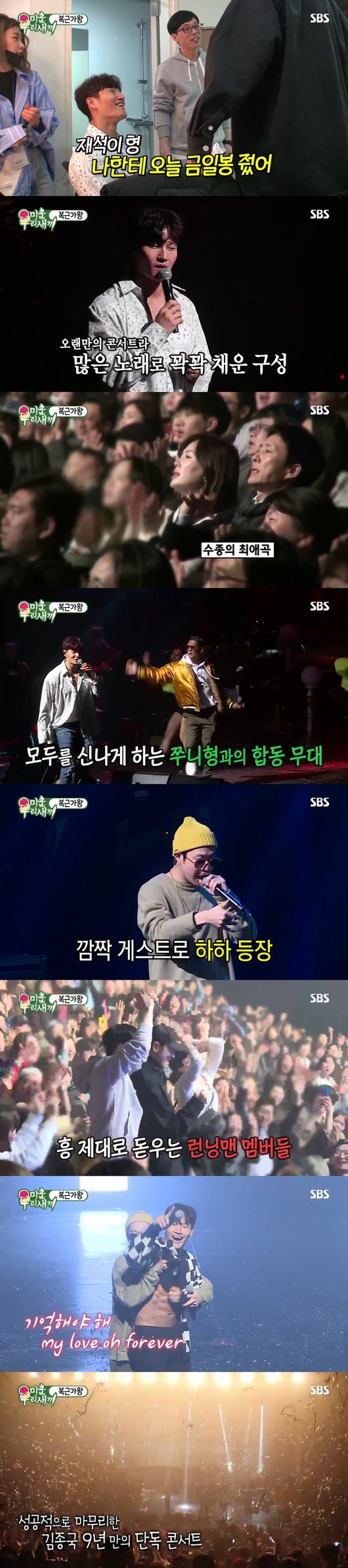 김종국의 콘서트에는 어머님들과 최수종, 하희라 부부가 와서 함께 즐기는가 하면, 깜짝 게스트로 박준형과 하하가 출연해 시선을 집중시켰다. 하하는 공연 말미에 김종국의 복근을 공개하는 등 깜짝 돌발 행동으로 객석을 술렁이게 만들었다. 이에 김종국은 “내 복근 봤으니까 더 큰 목소리로 해줘요”라며 관객과 다같이 노래를 부르며 마지막 무대를 장식해 감동을 선사했다. /parkjy@osen.co.kr