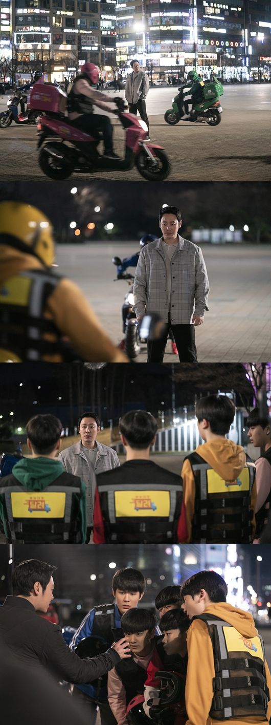 가장 눈길을 끄는 것은 바로 김동욱과 정체 모를 배달원 군단과의 대치 상황이다. 오토바이를 탄 배달원 군단이 김동욱을 둘러싸고 위협적으로 빙빙 돌고 있는 모습이 담겨 있기 때문. 하지만 그 중앙에 떡 하니 서 있는 김동욱은 긴장한 기색이나 한 치의 흔들림 없이 오히려 여유롭게 그들을 바라보고 있어 ‘전설의 조장풍’다운 포스를 내뿜고 있다. 이어 배달원 군단과 마주선 채 그들을 바라보고 있는 김동욱의 눈빛에서는 그 어떤 액션도 취하고 있지 않지만, 생활밀착형 히어로의 아우라가 고스란히 느껴진다.