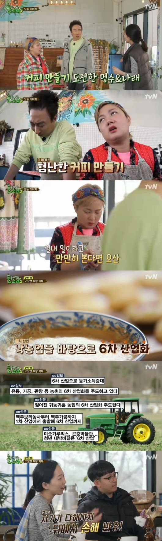 목장을 찾은 멤버들이 그려졌다. 끝이 없는 동물들과의 목장 하루를 예고해 기대감을 안겼다. 먼저 동물농장 투어 후, 어디론가 향했다. 바로 카페였다. 직접 만든 수제간식거리와 유제품들이 가득해 손님들의 시선을 사로 잡았다. 낙농업을 바탕으로 6차산업화 된 구성에 한태웅은 "자기가 다 해야지 안 그럼 뒤에서 손해본다"면서 "농업이 실질적으로 남는 것 없어, 유통까지 내가 하면 남는게 조금이라도 생겨 관심이 많이 간다"며 6차 산업을 꿈꿨다.