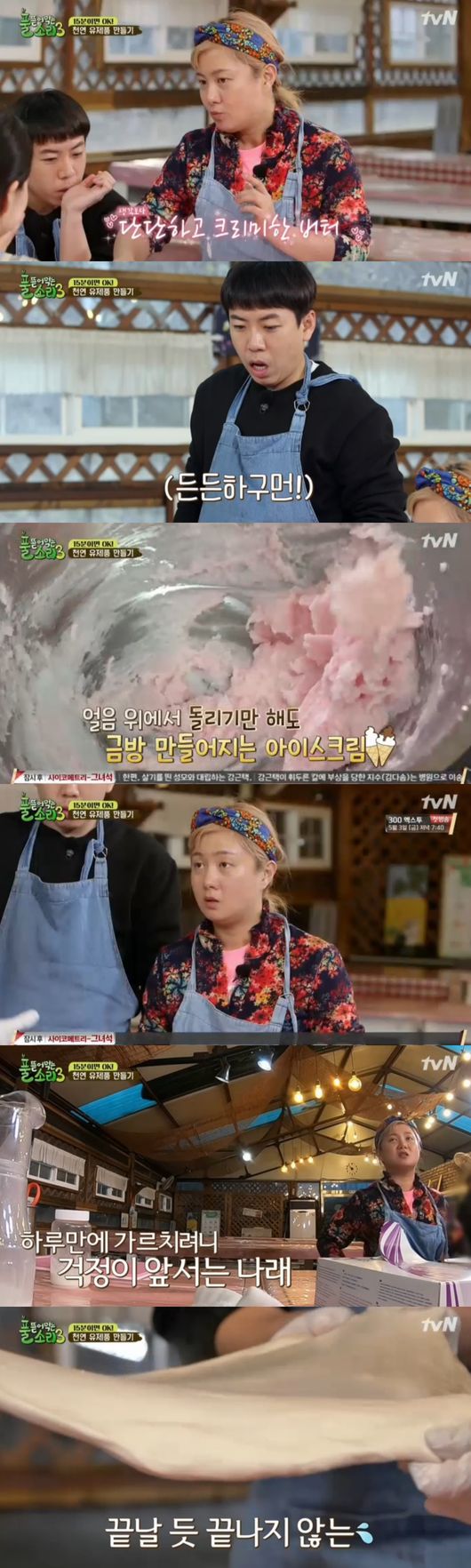 다음은 박나래와 양세찬이 체험준비를 하기로 했다. 해가 저물어도 목장일은 끝이 보이지 않았다. 체험장의 꽃인 버터 아이스크림 시작, 박나래가 에이스로 떠올랐다. 급기야 "체험 선생님으로 딱"이라며 칭찬도 들었다. 열혈 수강생 모드로 필기도 열중했다. 순식간에 직접 만든 버터를 완성, 두 사람은 "단단하고 크래미해, 땅콩버터 식감에 밀크아이스크림 맛이다"며 감탄했다.
