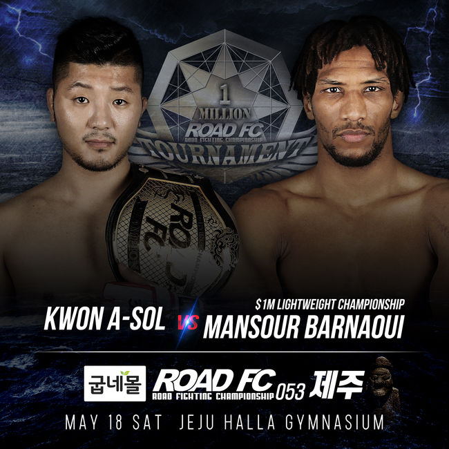 ROAD FC (로드FC)는 5월 18일 제주 한라체육관서 굽네몰 ROAD FC 053 제주를 개최한다. ‘끝판왕’ 권아솔과 ‘도전자’ 만수르 바르나위의 대결로 100만불 토너먼트가 마무리된다.