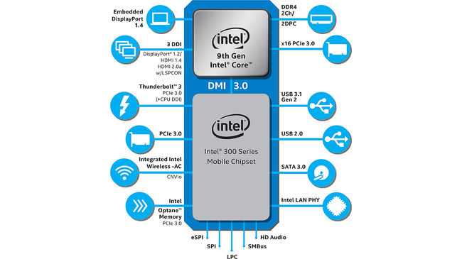 9세대 인텔 코어 모바일 프로세서는 모바일 폼팩터에서 데스크탑 수준의 성능을 제공하며, 가장 빠르고, 신뢰할 수 있는 무선 기능을 제공하는 인텔® 와이파이6 AX200 (Gig+), 가장 활용도 높은 유선 연결성을 제공하는 썬더볼트™ 3, 그리고 인텔® 옵테인™ 메모리 기술과 같은 뛰어난 성능을 지원한다.