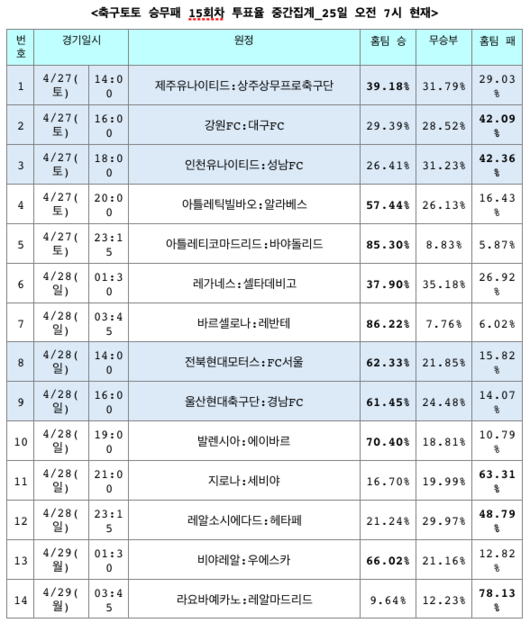 한편, 이번 승무패 15회차는 오는 27일(토) 오후 1시50분에 발매를 마감하며, 경기가 모두 종료된 후에 결과가 공식 발표된다.