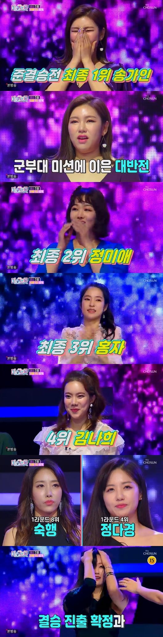 앞서 준결승 1라운드에서 정미애가 모두에게 칭찬을 받으며, 700점 만점에 658점을 얻어 홍자를 꺾고 1위에 올랐다. 12명 가운데 1위를 차지했고, 홍자는 2위, 정다경은 3위로 하락했다. 300명의 관객 점수가 합산된 결과 1위 정미애, 2위 홍자, 3위 송가인, 4위 정다경, 5위 김나희였고, 송가인은 "나도 3등을 할 수 있구나, 나도 내려갈 수 있다고 생각했다"며 걱정했다.
