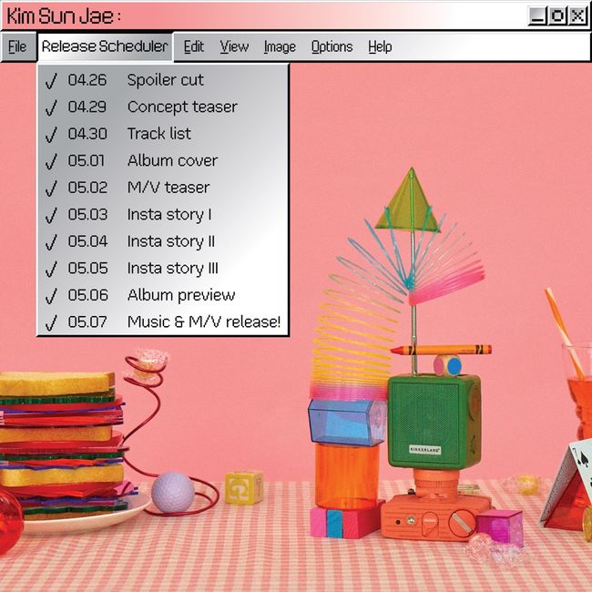 앞서 김선재는 데뷔 알림 티저에 각 곡의 모티브가 되는 소품들을 장난감 조립 일러스트로 표현하며 보는 재미까지 선사한 바 있다. 이번 스케줄러 역시 컴퓨터 화면에서 모티브를 얻었다. 여기에 다채로운 색감이 돋보이는 키치한 감성의 오브제로 이번 앨범에 대한 궁금증을 높이고 있다.